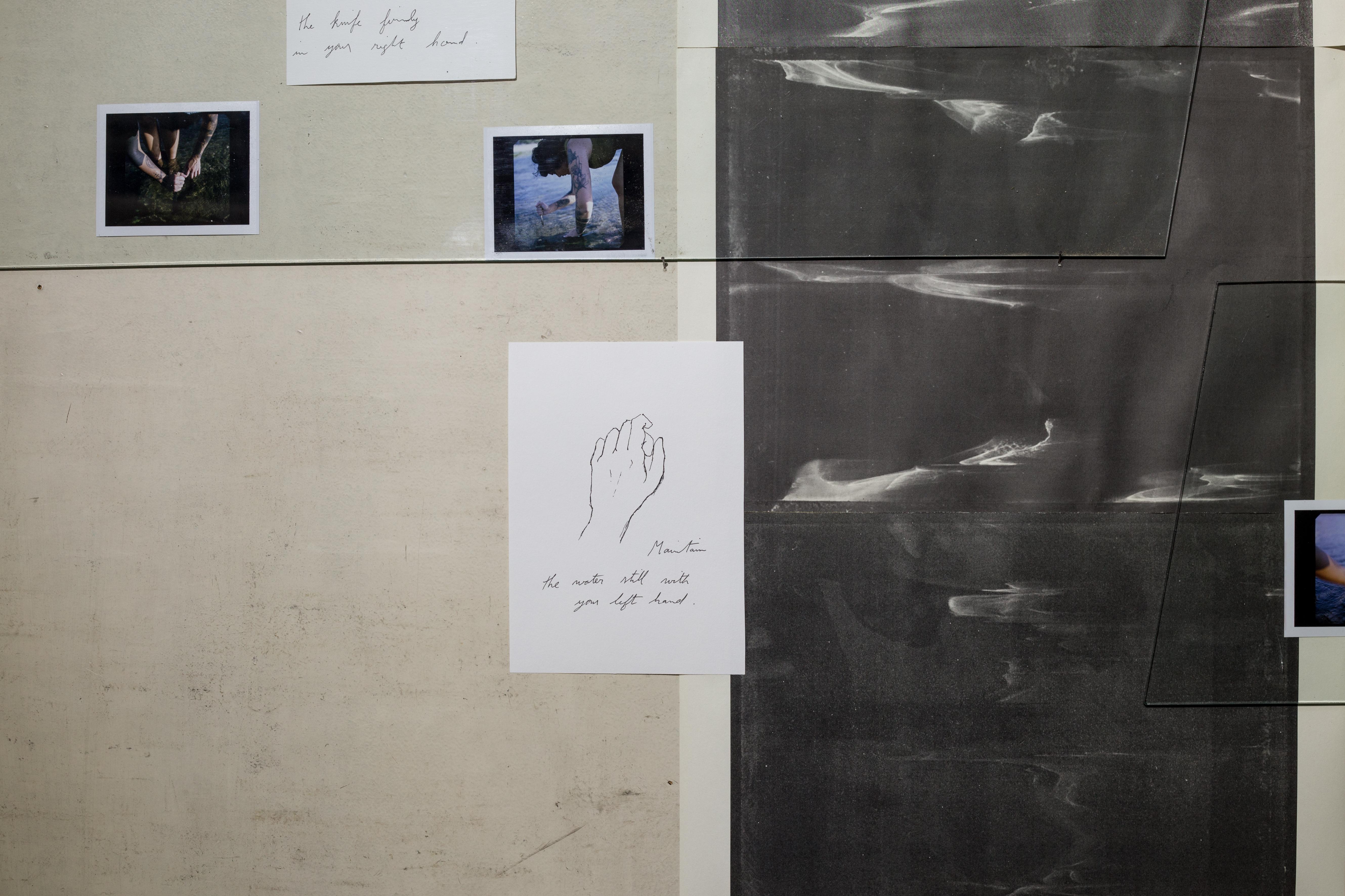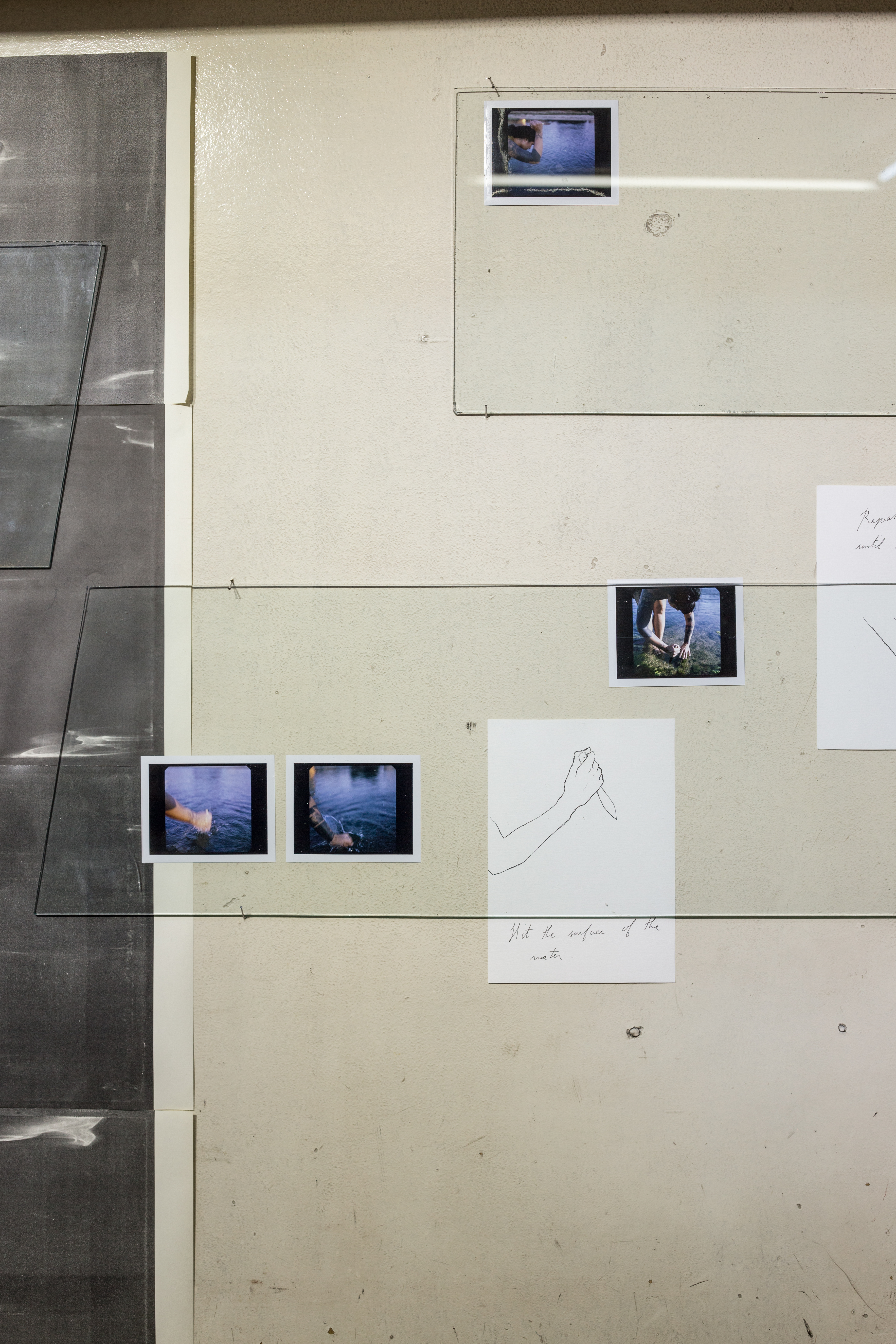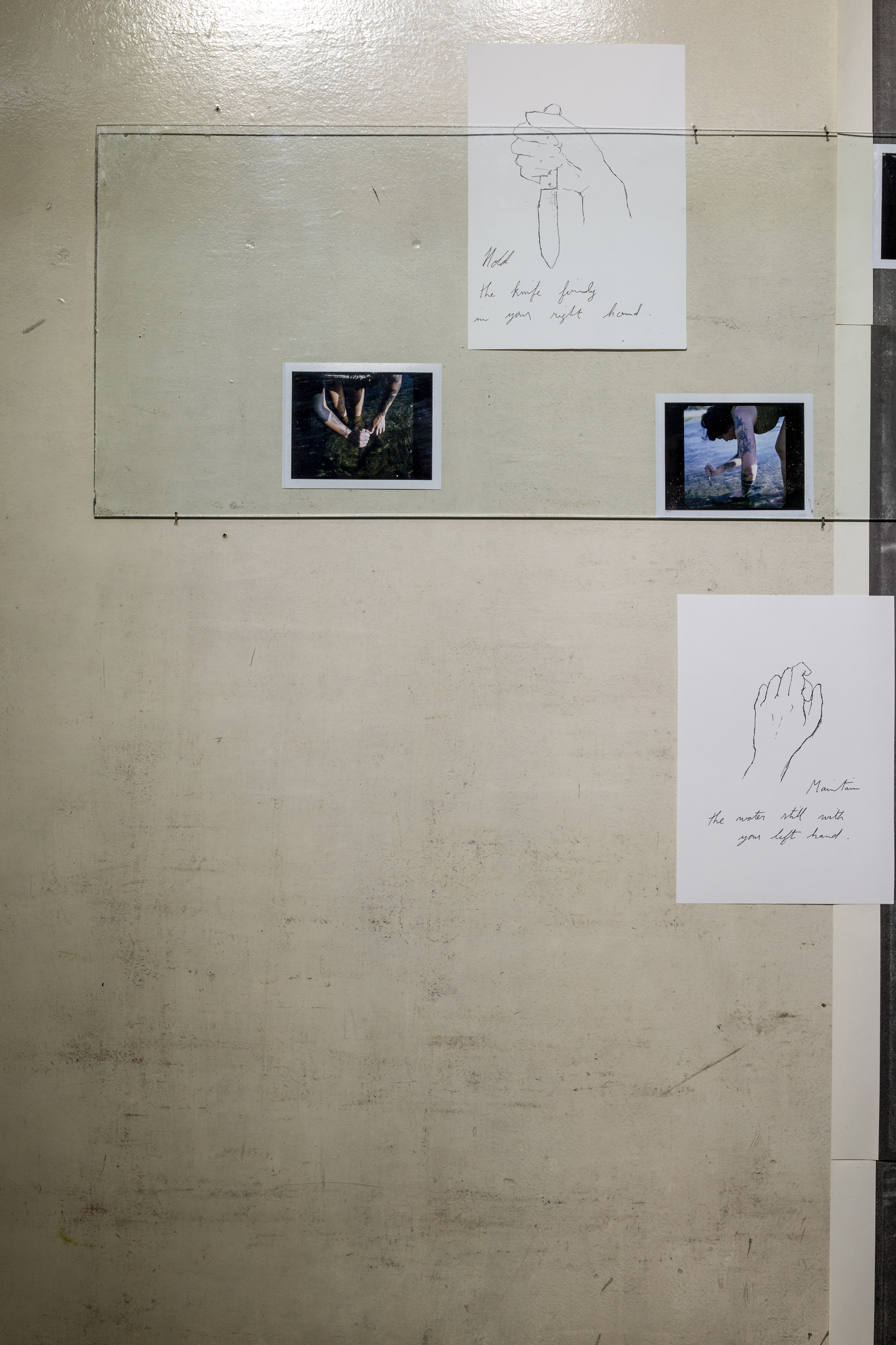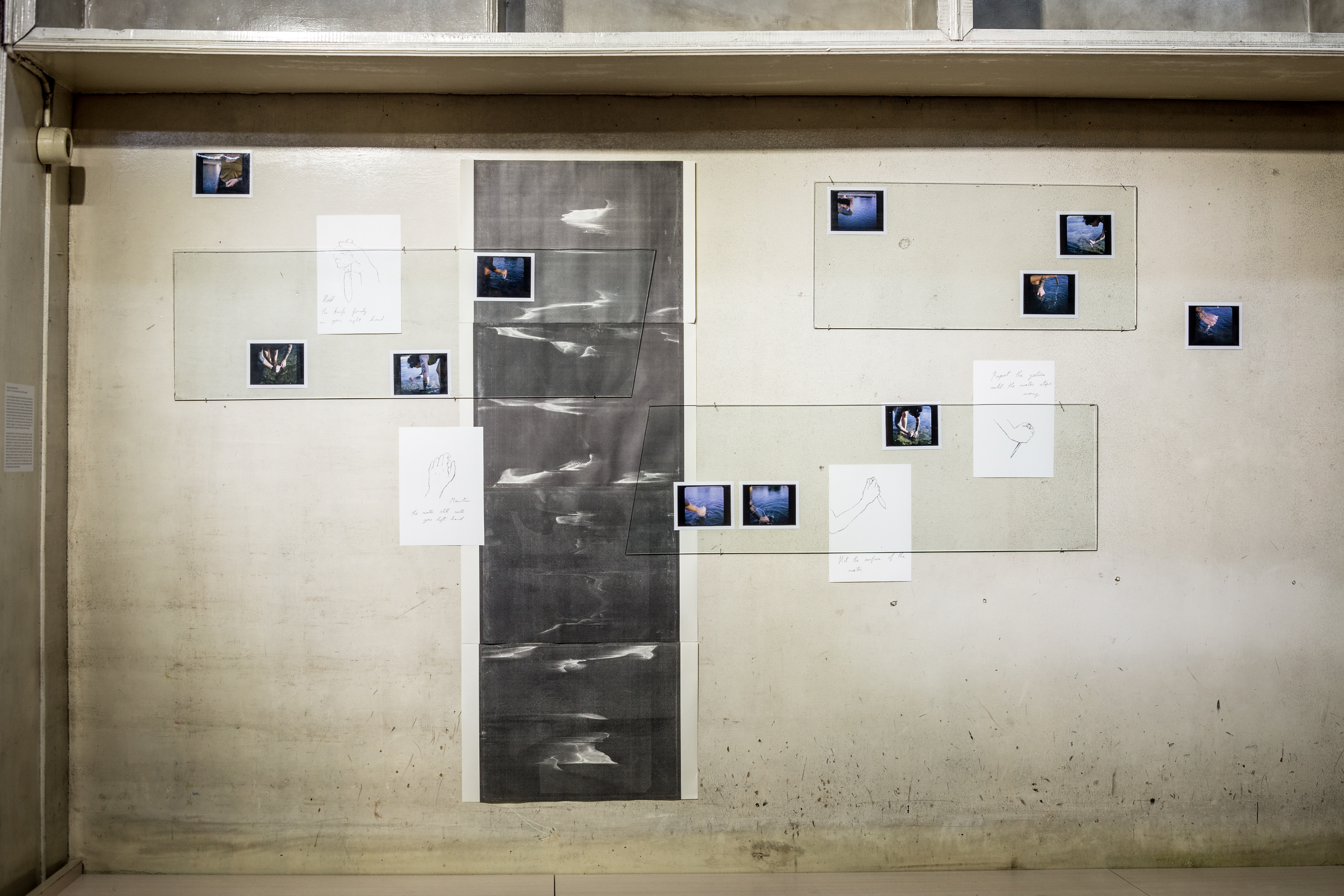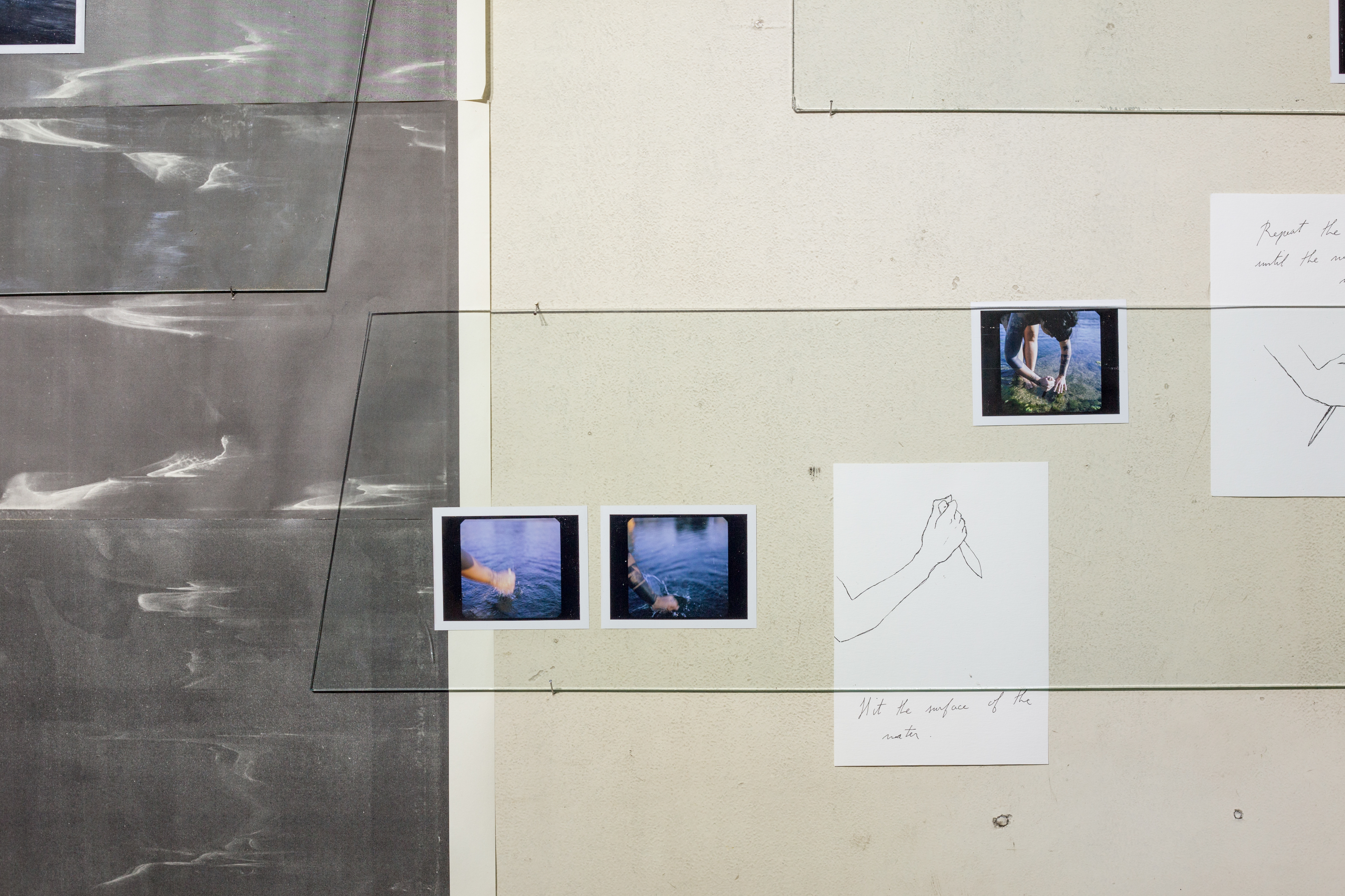 A quest with an irrational end: stabbing a river. An oneiric gesture towards the landscape captured by the river Seyhan, in Adana. Here, the act of stabbing repeated towards the exhaustion of the subject (the river, or the stabber?), is declinated through an assemblage layering the traces of those strokes. Medium format polaroids merge with film negatives enlarged to the point they become some abstract landscapes resembling the surface of the wounded river, and drawings with instructions on how to stab a river to death: “Hold the water firmly with your left hand”, “hit the surface of the water [with the knife]”, “repeat the gesture until the water stops moving”. The whole body is engaged in a very physical gesture, the repeated stabbing of a constantly renewed flow, a romantic duel with Nature towards a vain exploit.